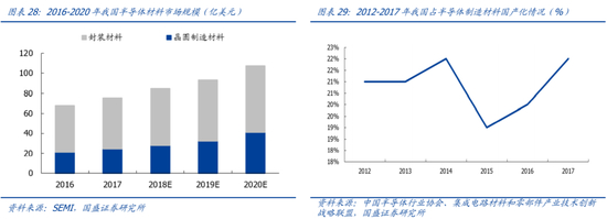 我国半导体材料市场规模为85亿美元,同比增长12.3%,其中晶圆制造材料及封装材料市场规模为约28.2亿美元和56.8亿美元。未来2年我国半导体材料市场规模将持续高速增长,预计2020年我国半导体材料市场规模达107.4亿美元,其中晶圆制造材料市场规模达40.9亿美元,2016-2020年CAGR为18.3%;封装材料市场规模达66.5亿美元,2016-2020年CAGR为9.18%。
