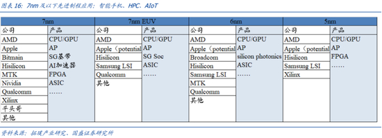 创新推动先进制程需求,海思是重要的先进制程尝鲜者,与代工厂有较深技术交流。最先进制程主要是为logic和部分RF提供,随着创新不断升级,5G、AI、物联网等需求提升,创新导入时使用的制程工艺从成熟向先进工艺升级。目前先进制程的供给端只有台积电、三星、英特尔。由于昂贵的成本,制程升级后的设计厂商越来越少,10nm工艺客户已经超过10家,7nm EUV客户至少5家(苹果、海思、高通、三星、AMD),6nm客户除了7nm EUV的5家还多了博通、联发科。