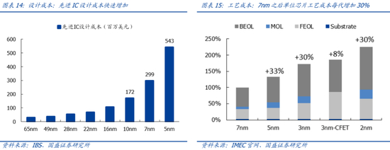 先进制程的持续升级带来巨额的成本。根据IBS,3nm芯片的设计费用约5~15亿美元,工艺开发费用约40~50亿美元,兴建一条3nm产线的成本约150~200亿美元。3nm芯片仅比5nm芯片提升15%性能、降低25%功耗。根据IMEC论文,7nm以后,每一代升级单个晶圆的工艺成本(Process Cost)提升幅度达到30%。同样面积的硅晶圆,即使通过微缩增加了晶体管的数量,生产成本也会相应增加。