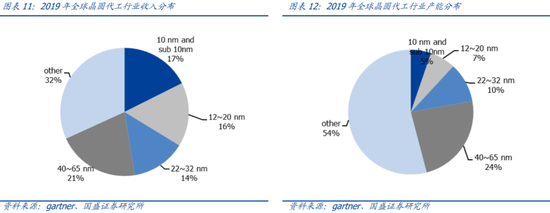 2020年晶圆代工市场重返增长,0.016micron、0.032micron为当前收入占比最高的节点。根据Gartner,2019年全球晶圆代工收入627亿美元,增速为-0.2%。预计2020年增速回到8%。结构上,收入贡献最大的为0.016micron(12/14/16nm),达到97亿美元;其次为0.032micron(22/28/32nm),达到86亿美元。10nm预计26亿美元,7nm预计85亿美元。台积电2019年收入为346亿美元,占比达55%。