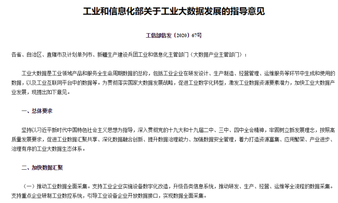 5月13日,工业和信息化部发布《关于工业大数据发展的指导意见》,明确促进工业数据汇聚共享、深化数据融合创新、提升数据治理能力、加强数据安全管理,着力打造资源富集、应用繁荣、产业进步、治理有序的工业大数据生态体系的总体要求。《指导意见》还提出加快数据汇聚、推动数据共享、深化数据应用、完善数据治理、强化数据安全、促进产业发展、加强组织保障等七方面21条指导意见。