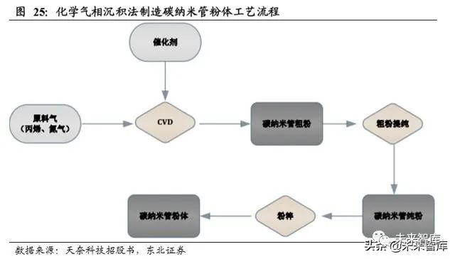 碳纳米管粉体的制备工艺依托于学术界的不断研究。碳纳米管是纳米级材料,属于 高端化工行业。最早由日本 NEC 公司基础研究实验室饭岛博士发现,由于结构特 殊被认为具有极高的理论研究和实际应用价值,随后学术界对其进行了大量研究。直到 2007 年日本首次开发出在大面积金属板上合成大量单层碳纳米管的技术,采 用了“Super Growth”化学气相生成法,为后来产业化的奠定基础。