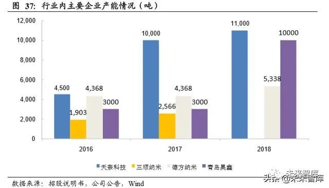 目前行业内主要企业的产能规划能够满足需求,2018 年天奈科技、德方纳米和青岛 昊鑫的产能分别为 1.1、0.53 和 1 万吨(青岛昊鑫含石墨烯产能),2017 年三顺纳米 产能达到 0.26 万吨。2018 年天奈科技、青岛昊鑫产能利用率分别为 71.7%、68.7%。考虑到行业整体 2018 年需求约为 3 万吨,行业的产能规划基本能够满足需求,其 产能利用率处于高位。
