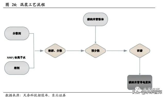 锂电池用碳纳米管浆料的第二部是混浆。其工艺流程较为简单,附加值不高。主要 是将分散剂、溶剂和碳纳米管溶解、分散形成浆料。