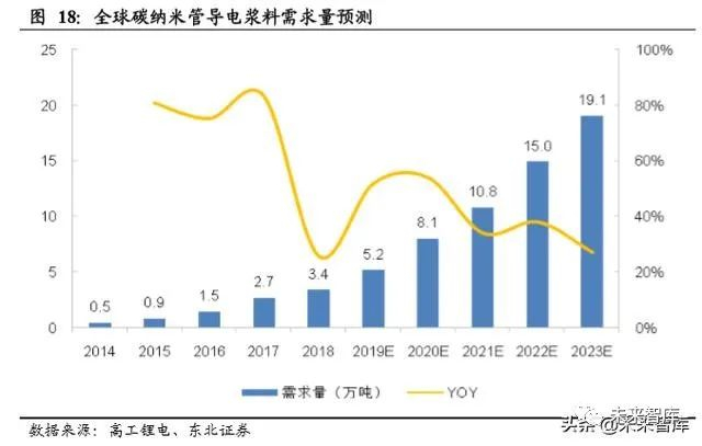 目前宁德时代 CATL 用量较小,主要使用传统导电剂。2018 年宁德时代向天奈科技 材料 1955 万元碳纳米管导电剂,经测算约对应 0.98GWh 的电池,占比不高。目前, CATL 与青岛昊鑫开展商务谈判和技术谈判,并接受青岛昊鑫产品进行了送样检测。 国内市场期待宁德时代的导电剂产品升级,碳纳米管需求量大增。