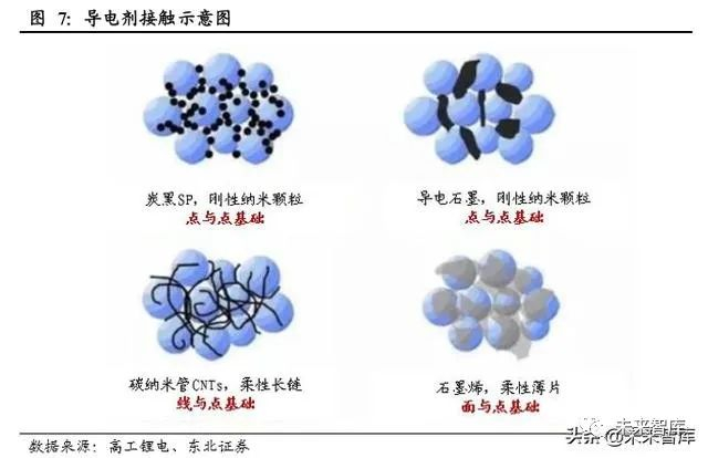 不同导电剂的微观结构各不相同,按包覆的接触面积来分,可以大致分为点接触(如 炭黑、导电石墨)、线接触(碳纳米管、碳纤维)和面接触(石墨烯)。接触面积越 大,导电能力越好,但其生产工艺更加复杂,成本也更高。碳纳米管的线接触实际 上就是在活性物质的微粒上搭上“导电桥”,因此导电效果更好。