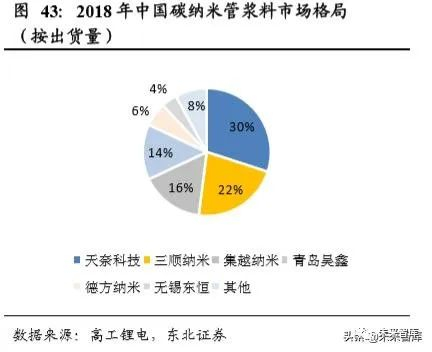 较少的掺杂量弥补了碳纳米管高价的劣势。一般而言,导电剂添加量为正极或负极 重量的 1%-3%。炭黑在正极材料中的添加量一般为 3%左右,而碳纳米管、石墨烯 等新型导电剂的添加量可降低至 0.5%~1%左右,达到同样的导电效果,碳纳米管的 用量仅为炭黑的 1/6~1/2。2018 年传统炭黑导电剂(SP)为 5.0-6.5 万元/吨,而碳 纳米管导电剂价格为 45-55 万元/吨,单价为炭黑单价的 10 倍。但由于掺杂量较小, 落实到单位成本,碳纳米管仅是炭黑单位成本的 1.7-5 倍。由于导电剂成本在锂电 池中占比较小,牺牲部分小成本而获得材料克容量增大、循环性能更好等优势成为 下游锂电池厂商的权衡考虑。