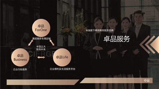 卓越高端商务物业服务,首创Concierge Service礼宾司服务理念,坚持“用心极致,满意+惊喜+感动”的服务理念,持续提升不动产运营价值。目前卓越礼宾服务已覆盖十余座大中城市。凭借近十年商务服务探索,2017年卓越礼宾正式发布了“让建筑森林更有温度与色彩”价值主张,以客户为中心,倡导人性化的沟通方式,不仅精心经营产品,更用心经营客户,让建筑不再冰冷,让场景和客户因为服务而互联,因互联而更有温度和色彩。2019年,我们的商务服务品牌再次升级,提炼出了卓越新商务时代-卓品文化的品牌升级计划,其中包含了卓品FORONE、卓品BUSINESS和卓品LIFE。卓品系列的三个模块分别针对不同的客户群体的多元需求, 提供更多样化的解决方案和专属服务体验。