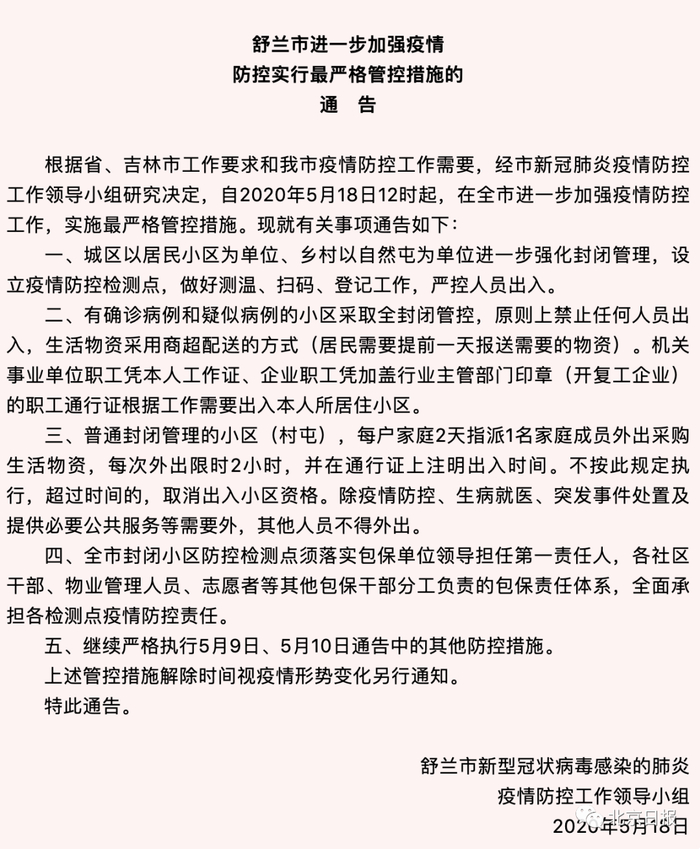 5月9日,舒兰市发布全面加强疫情防控实行严格管控措施的通告;