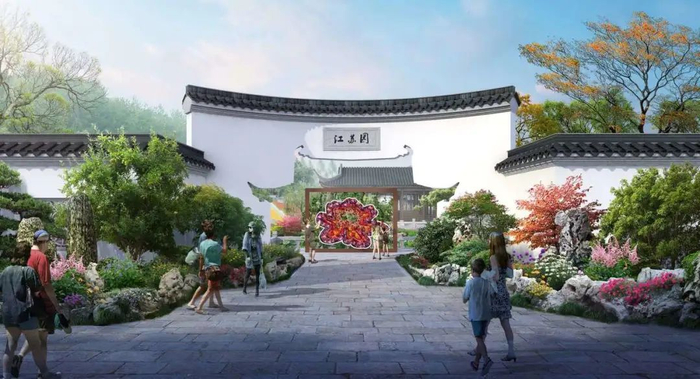 江苏展园位于上海、浙江两园之间,占地2500平方米。展园设计主题为“莳花六趣”,以六大赏花之趣贯穿全园,以“一核三心”“两廊六区”“五园七境“为规划结构,营造以新苏式建筑“花间堂”为核心,山水廊道、花园廊道交织,主题花园、特色花境相结合的庭院植物花卉景观。并融入生态绿色理念,采用“亲生物设计”,选择昆虫友好型的乡土植物,建起充满生机的“生态花园”。