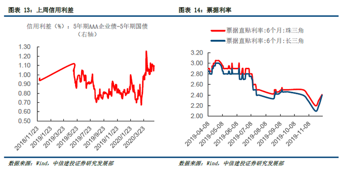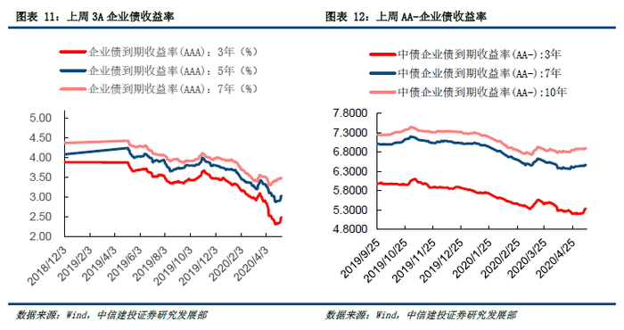 上周货币市场较为充裕,国债收益率与企业债收益率均有上行:上周DR007周五收报1.41%,周度均值较上周五下行19个BP;隔夜SHIBOR收报0.91%,周度均值环比上行下行25个BP;上周中债国债1年、5年和10年收益率分别报1.22%、1.97%、2.68%,1年、5年和10年收益率分别上行1BP、26P和4BP;7年期AA-中债企业债收益率周五收报6.57%,较上周上行11BP。