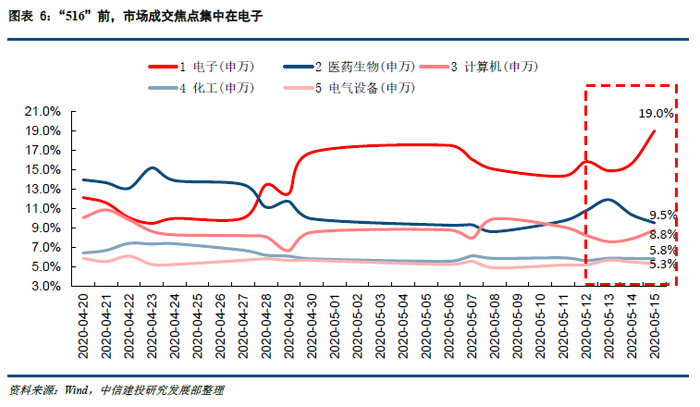 上周前半周美股调整引发投资者担忧,外资小幅流出,但随后美股反弹后外资重回流入。目前陆股通已连续8周净流入,上周净流入金额略高于上周。自3月中下旬市场反弹以来,两市成交额一直维持在6000-7000亿的水平,并没有起来的迹象。上周市场赚钱效应较弱,两市周度平均成交额下降到6202亿,周度环比下降715亿。经济数据披露后经济面底牌已现,但两会前政策尚未出炉,运行主线还有待挖掘,市场观望情绪很浓。成交集中的仍然集中在消费和核心科技的龙头,食品饮料贵州茅台估值已创10年新高,而计算机的信创板块和电子中的半导体板块也是牛股频频。最为亮眼的变化是电子成交占比大幅提升,从15%快速上升到19%。
