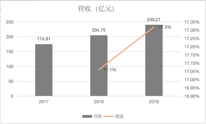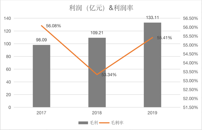 2017年~2019年, 农夫山泉分别实现销售收入174.91亿元、204.75亿元和240.21亿元,毛利分别为98.09亿元、109.21亿元和133.11亿元。2017年~2019年的毛利率分别为56.1%、53.3%和55.4%,其中包装饮用水在2019年的毛利率高达60.2%。