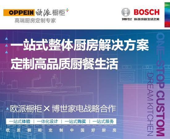 为顺应消费者需求及行业发展趋势,欧派橱柜除了不断完善自身柜体产品,同时还将通过欧派品牌厨电研发及与国内外知名电器品牌合作两种模式,以平台化思维构建整体厨房生态体系,不断探索橱柜与厨电的完美结合。基于此次合作,博世家电全系列产品将在欧派橱柜全国门店进行展示并授权销售。消费者可以在欧派门店进行高品质整体厨房场景化体验,享受专业设计师的厨房空间设计服务及一站式整体厨房购买体验。从而解决消费者厨房装修,“东市买橱柜西市买厨电”,柜电尺寸不匹配,风格不统一等问题,真正实现高品质整体厨房一步到位。