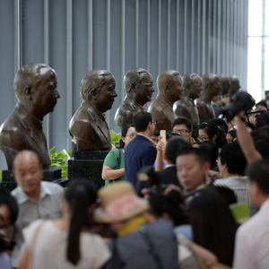 人们在宁波市宁波帮博物馆参观首批九位“宁波帮”代表人士的塑像 (鞠焕宗/摄)