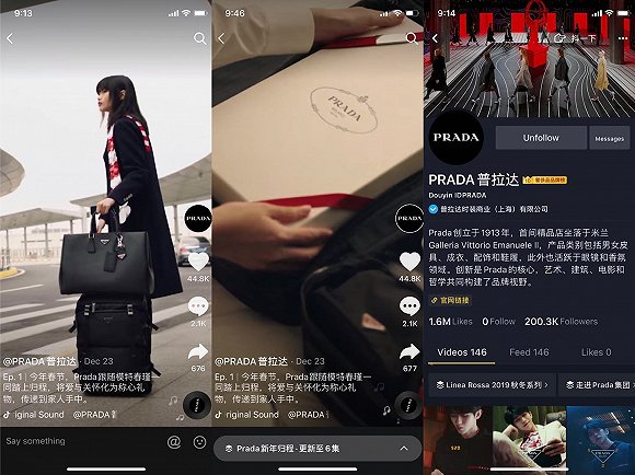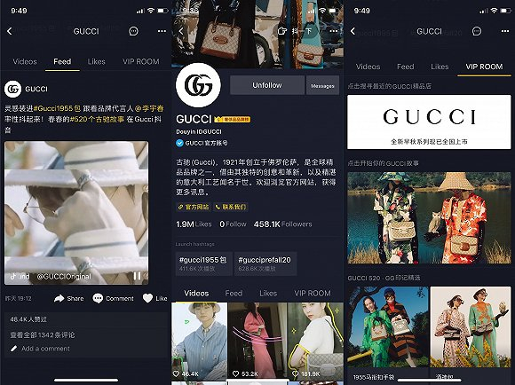 4月底, 意大利奢侈品牌 Gucci 在中国短视频社交平台抖音上开通了品牌官方账号,并发布了第一条视频内容, 截至发稿,Gucci 的抖音账号一周多时间内收获了39万粉丝。2019年底,法国奢侈品牌 CELINE 与抖音短视频国际版 TikTok上一名年仅18岁拥有770多万粉丝的人气博主合作拍摄了品牌官方大片。
