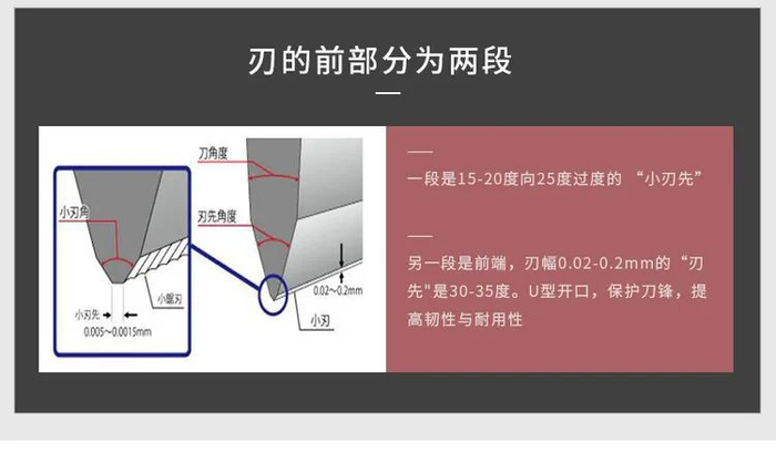 另一段是前端,刃幅0.02-0.2mm的“刃先”,角度是30-35°。