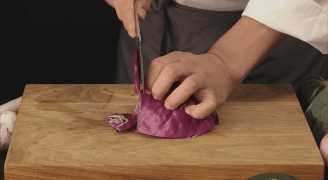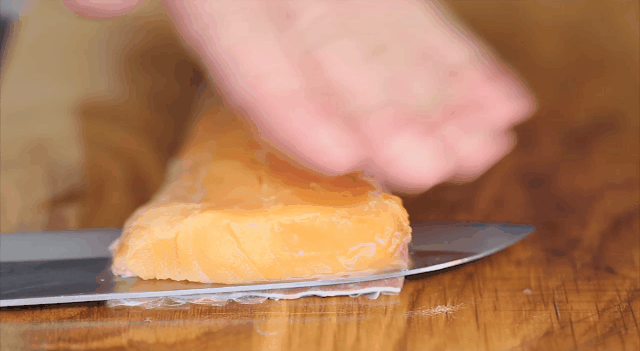 锋利的厨刀在切蔬果的时候,是轻快地划破表皮和果肉,而不是依靠刀身的重量去挤压蔬果。
