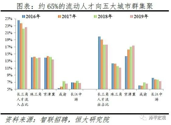 3)分城市群看,超6成人才流向五大城市群,2019年长三角、珠三角、京津冀、成渝、长江中游城市群人才净流入占比分别为5.0%、2.8%、-4.0%、0.0%、-0.5%,长三角、珠三角人才集聚,京津冀受北京控人影响人才净流出,成渝和长江中游基本平衡。从人才流入流出占比看,长三角人才流入占比和人才流出占比均呈下降趋势,2019年分别为22.6%、17.6%;珠三角人才流入占比较为稳定,人才流出占比分别逐年微降,2019年分别为13.9%、11.1%;京津冀2016-2019年人才流出占比分别为14.3%、16.2%、17.0%、17.3%,逐年上升;成渝人才流入占比和人才流出占比均较为稳定;长江中游人才流出占比逐年下降。2016-2019年分别有64.6%、64.7%、64.5%、63.1%的人才流入五大城市群,均超6成。从人才净流入占比看,2016-2019年长三角分别为4.7%、4.6%、4.6%、5.0%,人才净流入且占比高于其他城市群,人才大量向长三角集聚;珠三角分别为1.7%、2.0%、2.2%、2.8%,人才净流入且逐年上升;京津冀分别为-0.4%、-1.9%、-2.9%、-4.0%,人才净流出且流出规模逐渐扩大,主要受北京人才净流入占比逐年大幅下降影响;成渝分别为-0.7%、-0.2%、0.3%、0.0%,流入流出基本平衡;长江中游分别为-1.3%、-1.0%、-0.3%、-0.5%,流入流出基本平衡。