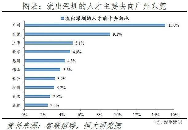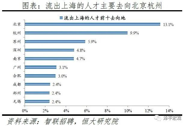 3)深圳:2016-2019年人才净流入占比分别为-0.2%、0.1%、0.4%、0.2%,主因深圳经济发展速度较快、人才政策有吸引力;深圳和广州互为人才外流第一目标城市,深圳流向广州和广州流向深圳的人才流出在全国流动人才总量中占比分别为0.7%、0.6%,规模基本平衡。2015年深圳常住人口增量从2014年的15万大幅上升至60万,2015-2018年平均增量为56万。2016-2019年深圳人才流入占比基本稳定在4.9%左右,分别为4.8%、5.1%、5.0%、4.7%,但人才流出占比呈下降趋势,分别为5.0%、4.9%、4.6%、4.6%。从来源看,人才向深圳流入的前十大城市分别为广州、北京、天津、东莞、上海、成都、长沙、武汉、惠州、佛山,合计占比达52.8%,高于2018年前十来源地的50.4%,深圳的人才来源集中度有所提高。其中,珠三角城市有4个,占比22.9%;流入深圳的人才中13.1%来自广州,流入广州的人才中17.4%来自深圳,深圳和广州互为人才来源城市的第1位。人才流入深圳主要因为经济发展速度相对较快和人才政策有吸引力。2019年深圳GDP增速6.7%,高于全国平均的6.1%,也高于北京和上海的6.1%、6.0%;2016-2019年深圳平均GDP增速为8.0%,高于广州、北京、上海的7.0%、6.6%、6.6%。深圳还拥有华为、腾讯、平安等众多著名企业,尤其是互联网企业,吸引大量人才。深圳的落户政策逐渐放宽,且补贴幅度较大,根据深圳市人力资源和社会保障局数据,2016年深圳将全日制本科生、硕士、博士的租房相关补贴从6000、9000、12000元分别提高至15000、25000、30000元,2017年落户门槛放宽至35岁以下专科学历人才,对新引进的两院院士和杰出人才、地方级领军人才、后备级人才分别给予300万、200万、160万的奖励。从去向看,深圳人才外流的前十大城市分别为广州、东莞、上海、北京、惠州、佛山、长沙、杭州、武汉、成都,合计占比达53.9%,低于2018年前十去向地的56.4%,深圳人才流向的方向更加分散。其中,广州占比达15.0%,珠三角城市有4所,合计占比32.3%,深圳和珠三角地区人才流动频繁;流出深圳的人才中15.0%流向广州,流出广州的人才中18.6%流向深圳,深圳和广州互为人才外流目标城市的第1位,深圳流向广州和广州流向深圳的人才流出在全国流动人才总量中占比分别为0.7%、0.6%,规模基本平衡。