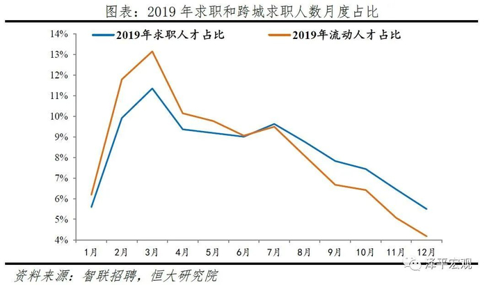 数据说明及特征:智联招聘拥有约2亿个人注册用户,日均活跃用户数(含登录、有求职行为的用户)约630万,其中,求职人才即当年有简历投递行为的用户中约85%为专科及以上学历,远超全国就业人口总体的14.6%(2015年小普查数据);在求职人才中,约四成为跨城求职者,即现居住城市和简历投向城市不同的流动人才。人才求职和跨城求职具有明显的月度波动性,求职高峰一般在春节后的3月,2019年3月求职人数和流动人数占比分别为11.3%、13.1%,2018年分别为12.1%、12.3%。