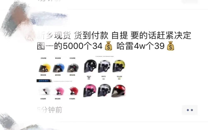 5月13日,张升以39元的单价购进1000个头盔,并通过朋友圈发布了销售广告。几分钟,他以69元的单价,将这些头盔卖给了郑州一个代理商,“一秒钟赚了3万”张升不敢相信,头盔竟然这么好卖。