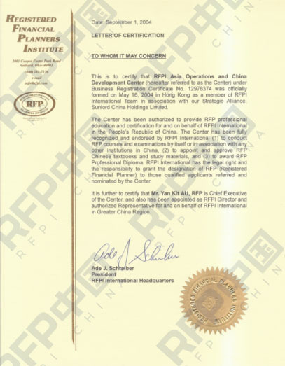 2003年,RFP率先成为进入中国地区的国际理财师资格认证。2004年,RFP学会委任首位华人董事欧仁杰先生,并授权其在中国地区设立RFPI Asia Operations and China Development Center(中文全名为“RFP学会亚洲事务暨中国发展中心” ),简称“RFP中国(RFPI CHINA)”,2005年开通中文官网。
