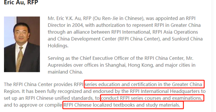 RFP学会在关于欧仁杰先生的介绍中,明确指出RFP中国经RFP学会批准,“在大中华地区开展RFP系列教育、认证,建立RFP的中文化标准并以此开展系列课程及考试,授权开发中国本土化的RFP教材和教学资料。”