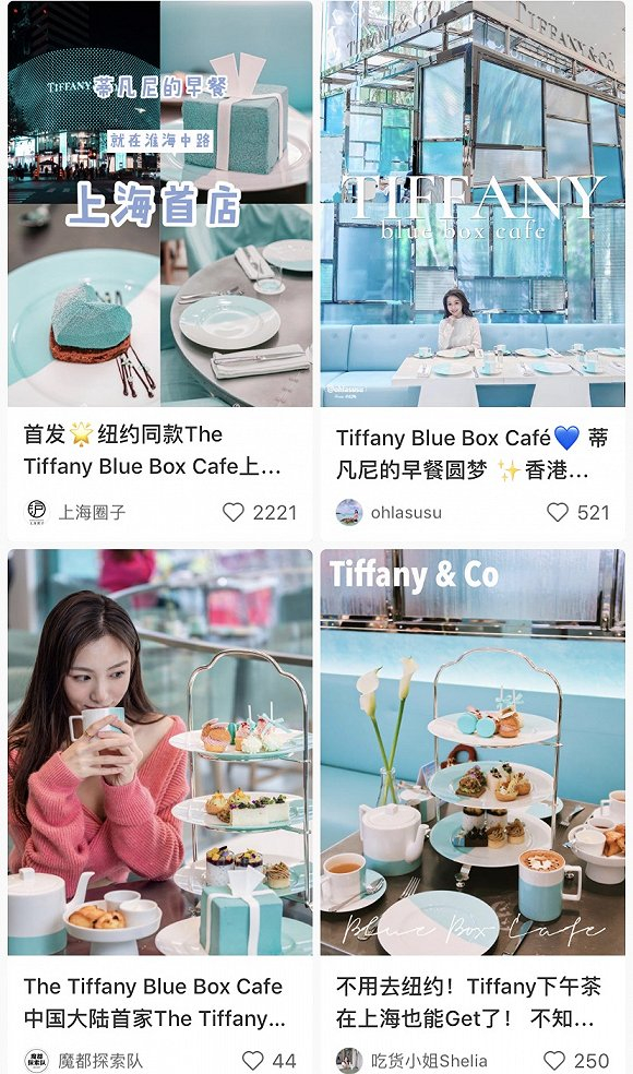 界面时尚查阅小红书发现,以“Tiffany餐厅”、“Tiffany Blue Box Café”等为关键词的笔记已经接近1万篇,许多用户会详细地写下探店心得,并配上多张精心拍摄的照片。虽然网友们对Tiffany Blue Box Café的餐点口味褒贬不一,但几乎所有人都认可这里十分适合拍照。