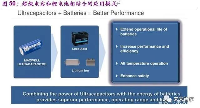 锂电池的缺陷主要是充电速度较慢、低温性能较差以及使用寿命不够长等方面。而超级电容器的拥有极短充放电时间、极佳使用寿命以及高可靠度。超级电容和锂电池模组相结合可以实现对新能源汽车进行快速充放电,延长电池使用寿命,提升性能和效率,改善在全天候环境下的使用和安全性能。但目前这一应用方向应该仍处于试验阶段。