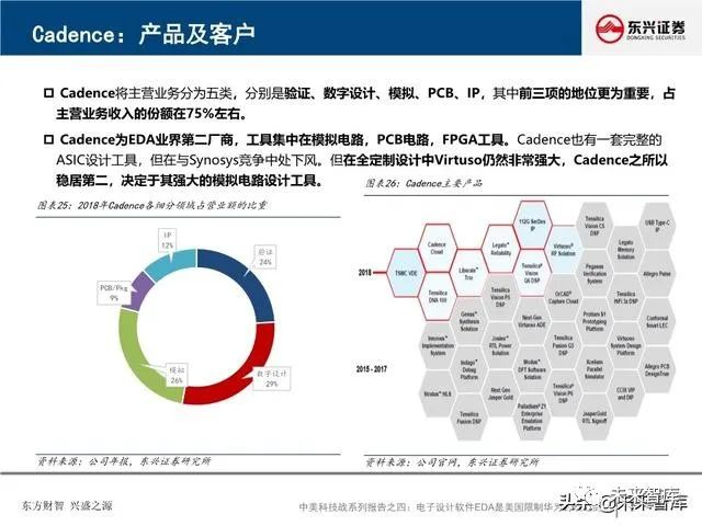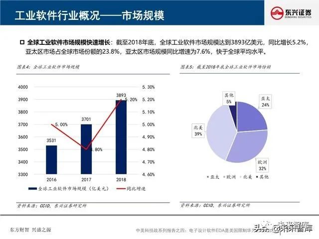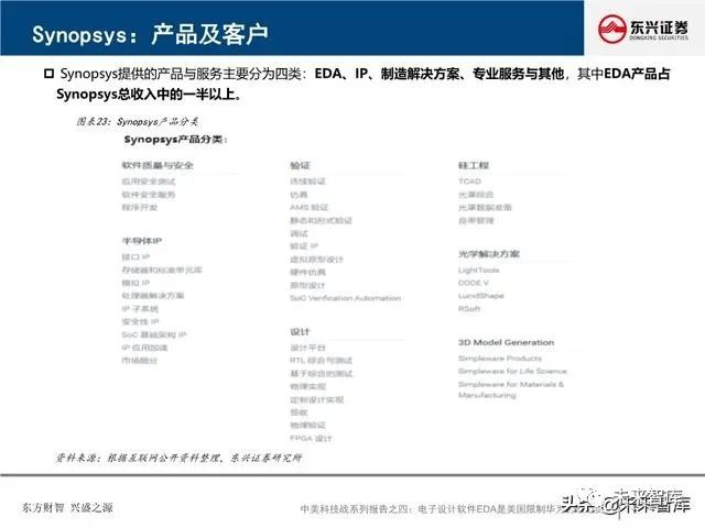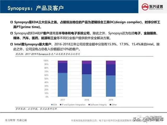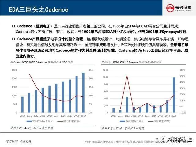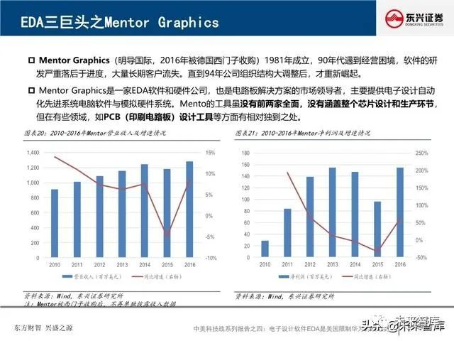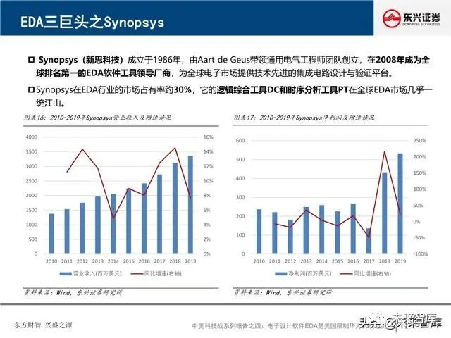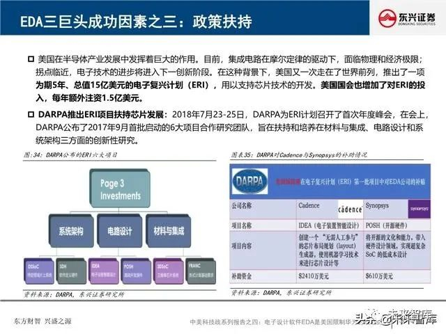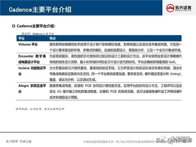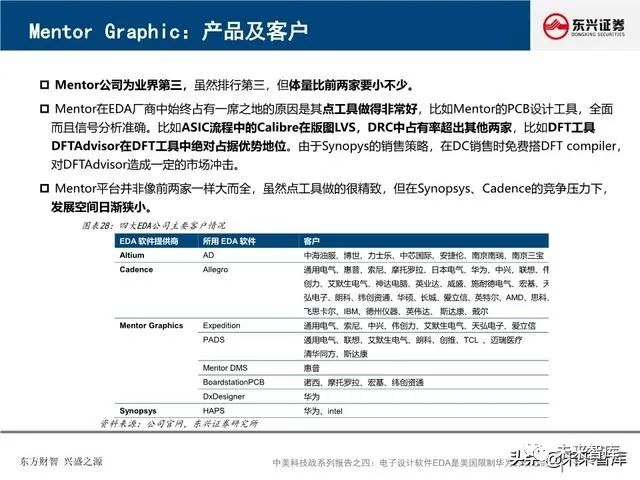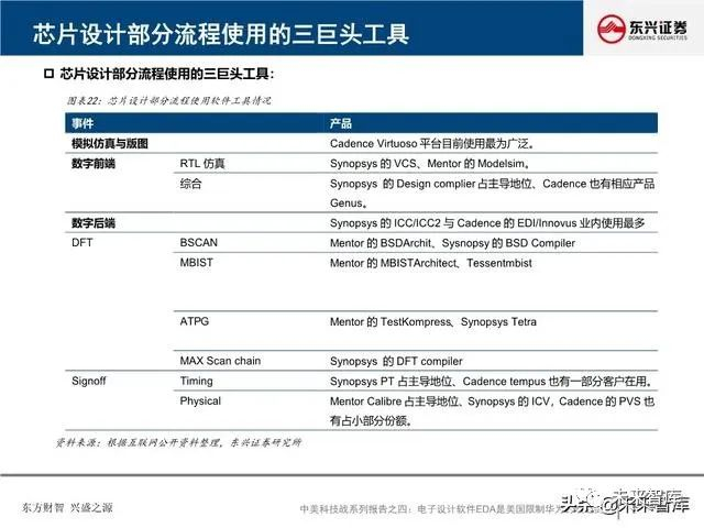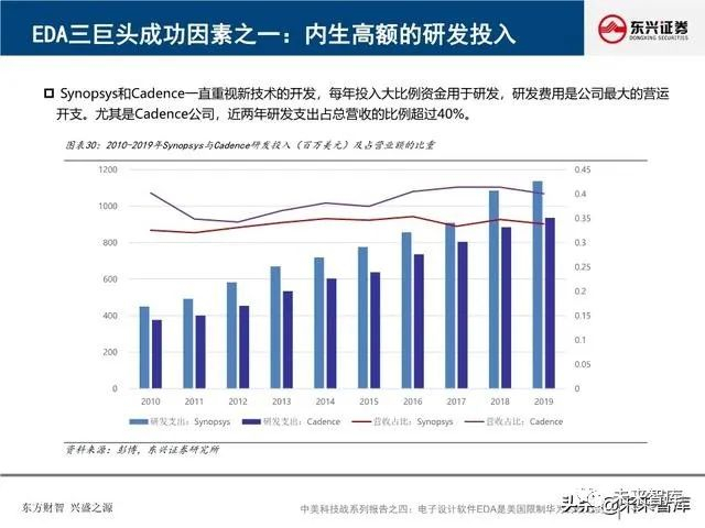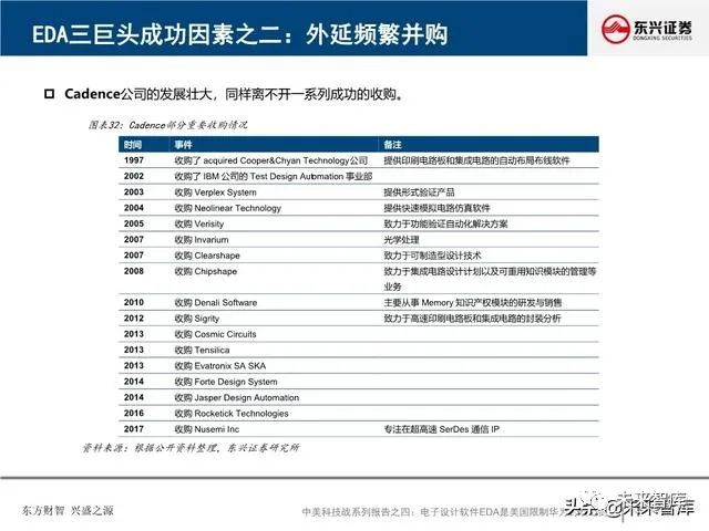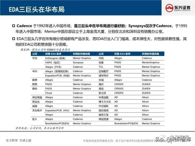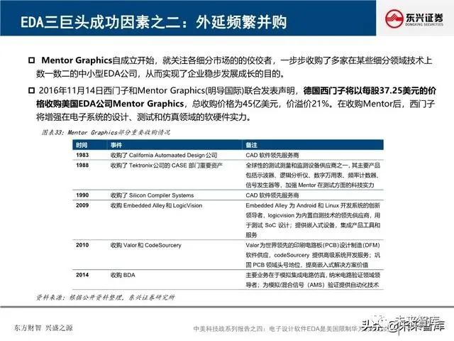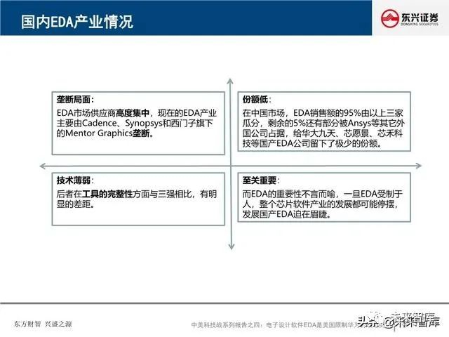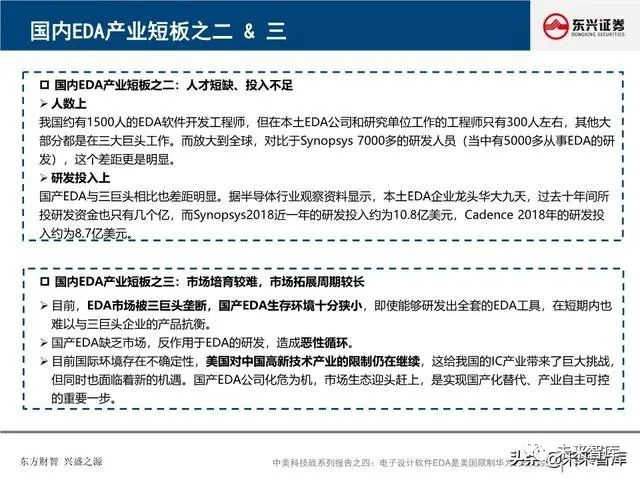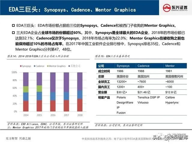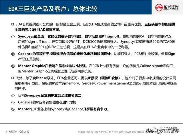全球EDA产业形成三巨头公司寡头垄断格局:EDA是集成电路产业链相对产值较小但又极其重要的关键环节, 具有“体量小、集中度高”的特点。全球EDA70%的市场份额都由EDA三巨头Synopsys、Cadence和西门 子旗下的Mentor Graphics占据。在中国市场,集中度更高,EDA销售额的95%由以上三家瓜分。探究三巨 头成功存在三要素:一、持续并购重组,二、高研发投入,三、美国政府的支持。
