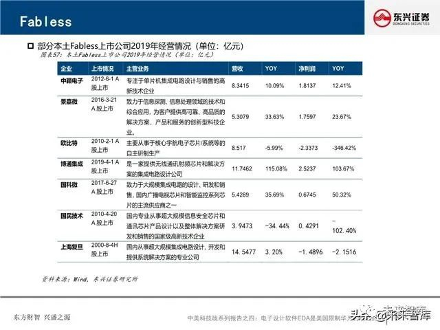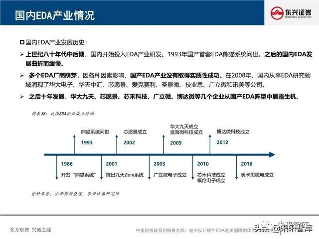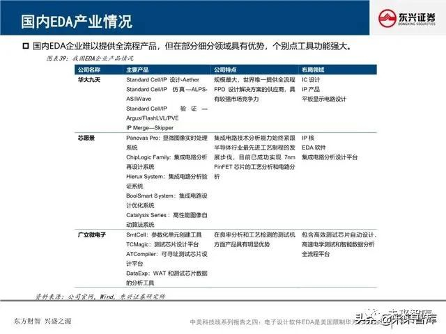 国产EDA软件工具积淀已久,本土EDA企业蓄势待发:国内EDA产业发展从上世纪八十年代中后期开始,本 土EDA企业有华大九天、芯禾科技、广立微电子、博达微科技、概伦电子、蓝海微科技、奥卡思微电等七家。这些企业虽然产品不够齐全、集成度不够高,但在点工具上取得了一定的成绩。其中,华大九天是全球唯一 的能够提供全流程FPD设计解决方案的供应商,获得了大部分知名面板厂的市场份额。