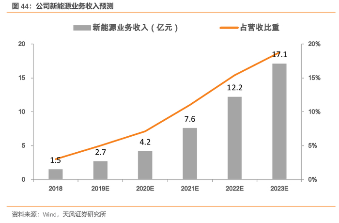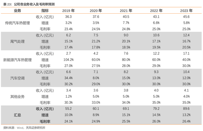 2020年下半年起订单加速释放,新能源业务收入及占比有望保持快速增长。结合公司现有新能源订单及客户拓展情况,我们预计公司2020年-2021年热管理业务营业收入分别为4.2和7.6亿元,2022年后有望突破10亿元,占收入比重提升至15%以上。