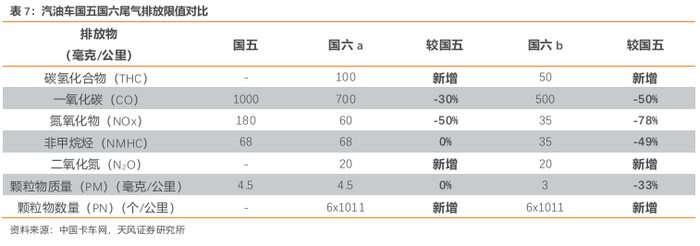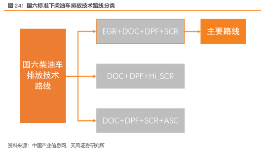 柴油车尾气处理:多技术融合成趋势,EGR、SCR、DPF、DOC将得到综合运用。随着国六法规的推进,排放限值的大幅趋严,单一尾气处理方法将难以满足要求。参考欧洲排放升级经验,在欧III(对应国三)阶段,车企利用机内措施便可满足排放法规要求;在欧IV、欧V(对应国四、国五)阶段,可分别通过EGR+DPF或SCR技术来满足排放法规要求;但在欧VI(对应国六)阶段,必须综合采用SCR、DPF等技术方能满足法规要求。我们预计,在国六阶段,SCR、DPF、DOC将成为国内柴油车的必备,同时辅以EGR、ASC(氨氧化催化剂)等技术,方能满足严苛的国六b标准。