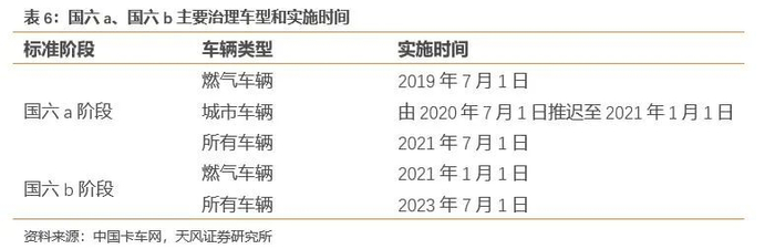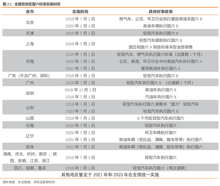 国六执行时间渐行渐近,多省市已提前实施。环保部分别于2016年和2018年发布针对轻型汽车和重型柴油车的国六标准。考虑到尾气排放技术升级的准备期、导入期以及我国较为严峻的空气质量形势,国六排放标准将分a、b两个阶段实施。国六a和国六b分别将于2021年7月1日和2023年7月1日对所有车辆实施,不符合相应排放标准的车辆将不允许销售。同时,为响应国家助力打赢“蓝天保卫战”的号召,全国多个省市宣布提前实施国六排放标准,其中北京、天津、上海、深圳等城市已率先开始执行国六b。