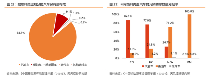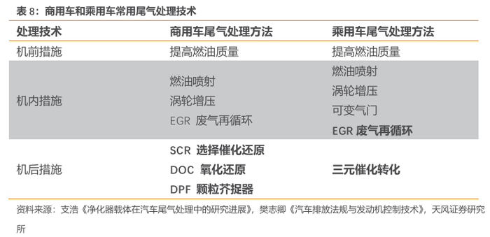 柴油车尾气处理侧重机后措施,汽油车侧重机内措施。控制汽车尾气排放的措施可分为机前措施、机内措施和机后措施三种。机前措施主要通过提高燃油质量来减少尾气污染物,如使用无铅汽油;机内措施主要通过燃油喷射、涡轮增压、废气再循环等装置来提高燃油效率,使燃烧尽可能充分;机后措施主要通过在汽车尾部排气管上安装尾气净化装置,通过净化器过滤或催化使尾气中的有毒气体(如 CO、NOx)充分燃烧或转化为无毒气体。由于尾气排放物及车体结构不同,柴油车(以商用车为主)倾向于采用 SCR、DOC、DPF等机后措施处理尾气(车体大,可携带更多的处理设备及化学催化剂);汽油车则倾向于采用EGR、涡轮增压、可变气门正时等机内措施(仅对发动机本身进行改造)。