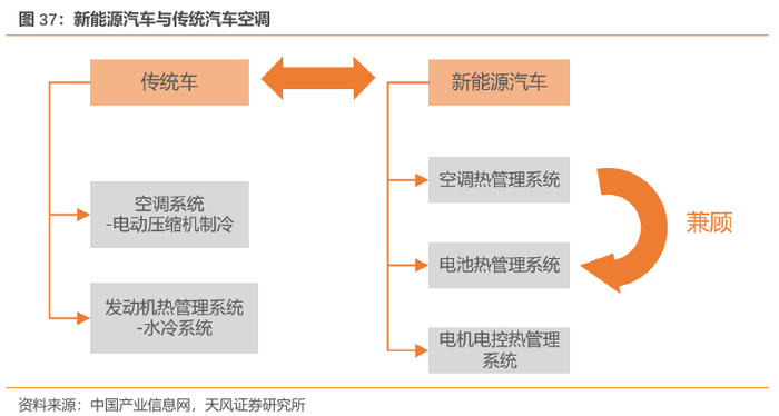 (3)动力源变化,集成度要求更高:传统汽车空调系统利用发动机余热对驾驶舱进行制热,利用发动机带动压缩机制冷;新能源汽车空调由于不能从发动机获得动力,需要使用一套全新的电动压缩机和热泵。