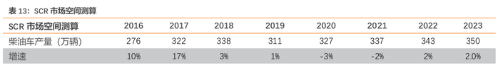 SCR渗透率尚有提升空间,预计将保持平稳增长。SCR是国五重卡尾气处理的首选,目前SCR在中重卡中的渗透率已经达到较高水平。国六阶段,预计SCR将加速向中轻卡渗透,在柴油车的渗透率有望在2-3年内提升至100%。预计2020年国内SCR市场空间34.7亿元,2023年SCR市场空间42.4亿元,2020~2023年复合增速6.9%。