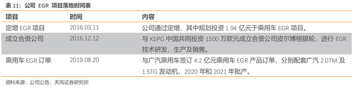 配套客户从商用车拓展至乘用车领域,获广汽乘用车订单。2017年,公司通过定增,其中规划投资1.94亿元于乘用车EGR项目。2019年公司获广汽乘用车EGR产品订单,分别配套广汽2.0TM及1.5TG两款发动机,预计分别将于2020年和2021年批产,全生命周期内预计为公司新增销售额4.18亿元。