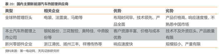 第三类参与者是国内新兴热管理类零部件企业,如浙江清优、祥博传热等。这类企业普遍成立时间较短,其优势在历史包袱少,可更专注于新能源汽车热管理的技术研发(无需兼顾传统汽车热管理),同时公司体制及管理方式更为灵活,响应速度快;但规模较小、产量有限、品牌知名度低等问题不利于其开拓新市场。