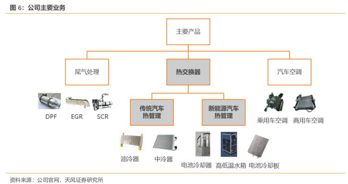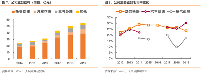 传统热交换业务夯实业绩基石,新能源热管理和尾气处理等业务成长迅速。公司主要业务可分为热交换器(分为传统汽车热管理和新能源汽车热管理)、尾气处理和汽车空调三大类。热交换器业务为公司业绩稳健增长的基石,2019年收入38.9亿元,同比增长6.6%,占总营收比例70%。公司于2016年开始大力投向新能源汽车热管理,目前主要产品包括电池深冷器、电池冷却板、PTC加热器、电子水泵、热泵空调系统等,配套客户包括通用、福特、宁德时代、吉利、广汽、比亚迪、宇通、威马等车企。尾气处理和汽车空调业务2019年分别贡献了6.2亿元和6.6亿元的收入,同比增速分别为14.8%和36.6%,占营收比例分别为11.2%和12%。