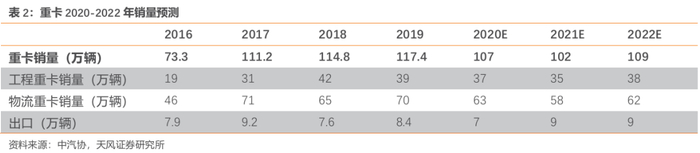 我们基于以下条件来测算未来重卡销量:(1)物流重卡:受益物流需求的稳健,物流重卡仍有新增需求,考虑疫情陆续结束带来的经济回暖,预计20-22年物流重卡的销量分别为63、58和62万辆。(2)工程重卡:工程重卡表现与房地产+基建相关性较强,房地产目前较为低迷,但我国基建政策持续加码,工程重卡销量有望保持平稳水平,预计20-22年物流重卡的销量分别为37、35和38万辆。(3)出口:2020年受海外疫情影响出口量将同比下降,未来有望恢复,预计20-22年出口量分别为7、9和9万辆。加总以上结果,我们预计2020-2022年重卡的销量分别为107、102和109万辆,需求保持较高水平。