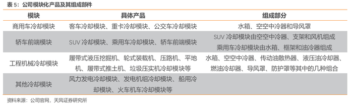 产品从单品向模块升级,单车配套价值量持续提升。公司产品从油冷器、中冷器等单一零部件出发,近年来逐步向模块化总成件升级。由于模块化产品集成了更多的零部件且整体技术含量较单品更高,因而带来了更高的单车配套价值量。目前公司能为乘用车配套的产品单车价值量1100~1700元,为商用车配套的产品单车价值量约3000~6000元,为工程机械配套的产品单车价值量约4000~7000元。未来随着新的产品不断开发,单车价值量有望继续增加。