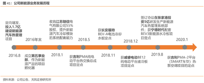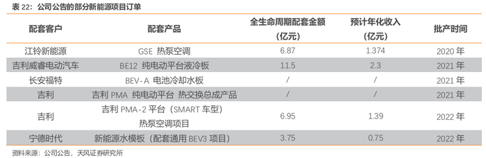 已拥有较多产品储备,配套客户从自主品牌向合资及外资品牌拓展。公司从2016年开始大力投入新能源汽车热管理领域,目前已具备高低温水箱、Chiller(电池深冷器)、电池冷却板、电机冷却器、电控冷却器、前端冷却模块、PTC加热器、电子风扇、电子水泵、电子阀等产品的量产能力,且配套客户逐步由宁德时代、吉利、广汽、比亚迪、宇通、威马、江铃等自主品牌向通用、福特、特斯拉等合资或外资品牌拓展。