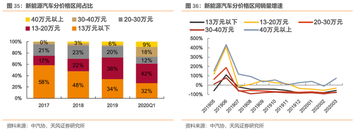 (3)市场化需求逐步体现:经历10年发展,新能源汽车发展已完成从0到1的蜕变,正在进入全面市场化的转折点。按价格区间看,2019年新能源汽车销量下滑更多是受13万元以下低端车型的影响,而13万元以上车型的销量同比增长18.9%,市场份额合计提升14%。20Q1随着特斯拉国产车型的导入,带来30-40万元区间占比显著提升,更是强化了这一趋势,显示新能源汽车市场化的需求正逐步加强。