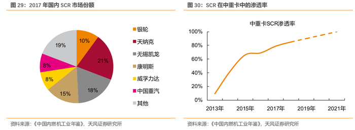 较早切入SCR领域,目前已拥有一定的市场份额。公司从2009年开始涉足SCR,并于次年成功开发出SCR系统;2011年将第一次增发所募集资金中的1.1亿元投向SCR,初步形成了1万套SCR系统及8万套SCR转化器的生产能力;2016年通过与全球领先的汽车排气控制系统供应商弗吉亚成立合资公司(银轮弗吉亚),进一步提高了SCR技术水平与品牌知名度。经过多年的发展,公司SCR产品主要配套潍柴等商用车客户,在国内SCR领域市占率约在10%左右(2017年)。