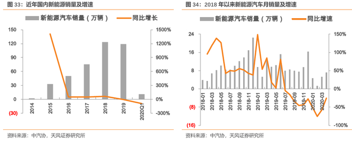 2019年下半年以来新能源汽车产业面临深度调整。2019年新能源汽车产业受补贴退坡影响较大,下半年月销增速大幅下行,全年销量119.1万辆,同比下降3.4%,出现近十年首次下滑。2020年初,叠加新冠肺炎疫情打击,20Q1国内新能源汽车销量仅11.2万辆,同比降幅达59.1%。