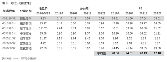 我们选取:(1)同在汽车零部件行业,且产品与客户持续升级的拓普集团、星宇股份、宁波高发;(2)主营尾气处理业务的威孚高科;(3)主营业务涵盖汽车空调的富奥股份;(4)积极拓展新能源汽车热管理的三花智控,作为可比公司。6家可比公司2020年PE均值为25倍,再考虑公司较好的成长性,给与20年30倍PE目标,对应目标价13.5元,维持“买入”评级。