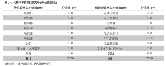 新能源热管理单车价值量较传统燃油车提高2-3倍。传统燃油车热管理系统主要包括压缩机、散热器、控制器等部件,合计单车配套价值量约2500元。与传统燃油车相比,新能源汽车热管理系统新增了电动压缩机、电子膨胀阀、电池冷却器、PTC加热器等部件,系统集成度及复杂度更高,合计单车配套价值量有望达到7000元。
