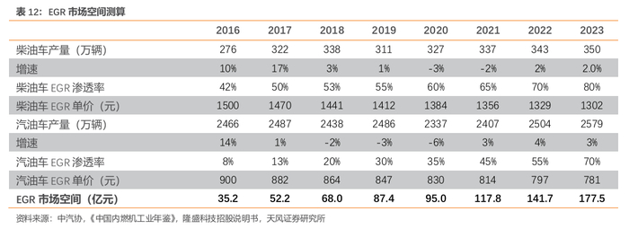 受益商乘两端渗透率快速提升,EGR市场规模有望迅速扩大。据《中国内燃机工业年鉴》等数据,我们预估现阶段EGR在柴油车中的渗透率约60%,在汽油车中的渗透率约35%。受益于商乘两端的节能减排趋势,EGR在柴油车和汽油车中的渗透率有望迎来同步提升,其中汽油车EGR因渗透率相对较低,预计提速更加明显。预计2020年国内EGR市场空间95亿元,2023年有望达到177.5亿元,2020~2023年复合增速23.2%。
